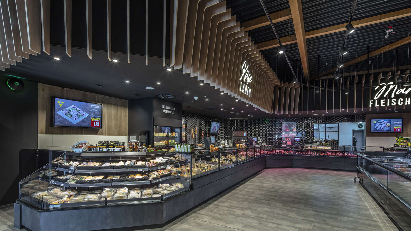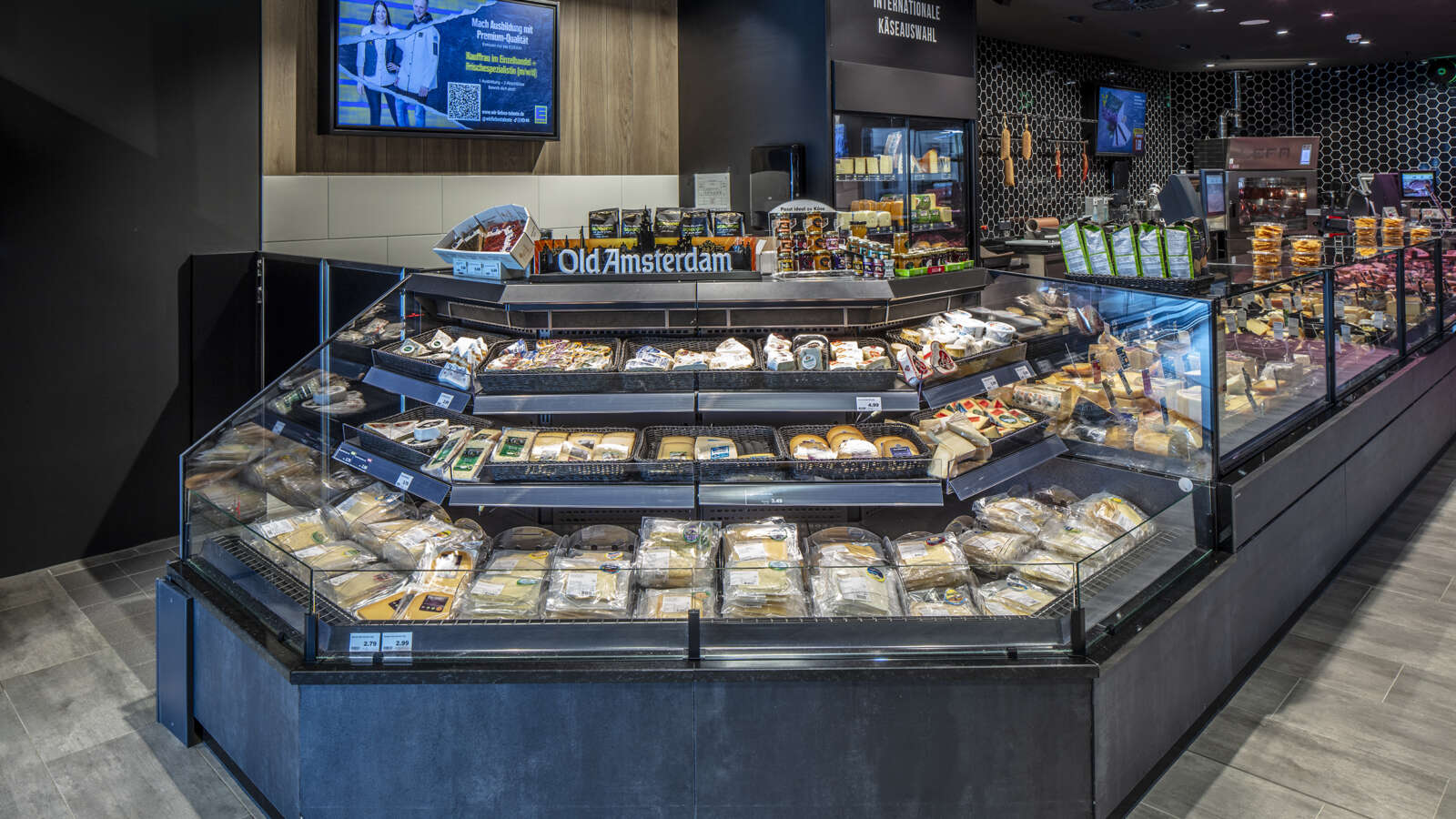 Fresh, regional, modern – this is how the EDEKA Center Holling in Geestland-Langen is now presented after its renovation. AICHINGER was able to provide tailor-made counter solutions for the fresh food area during the redesign of the store. The result is a spacious service area for meat, sausage products and cheese – with our award-winning SIRIUS®3 refrigerated counter, in which the goods are presented in a particularly sales-oriented way. Packaged goods can be found in a spacious self-service area made up of several modules of our TopSpot MIO+ self-service refrigerated shelving unit.